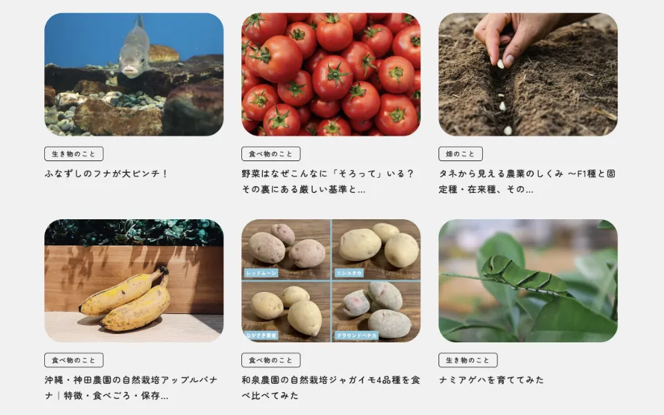 畑や生き物、食べ物にまつわるテーマを、ノカノワの視点でまとめた記事を公開しています。