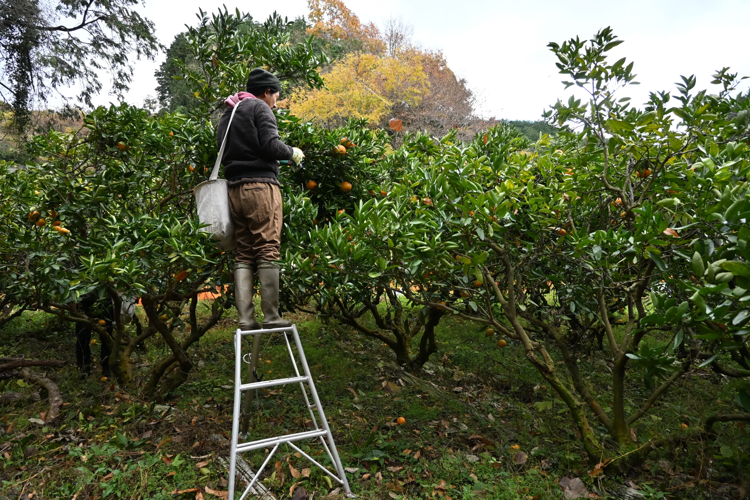 伊予柑の収穫作業は多くの場合、平らな場所に立って行えるものではありません。