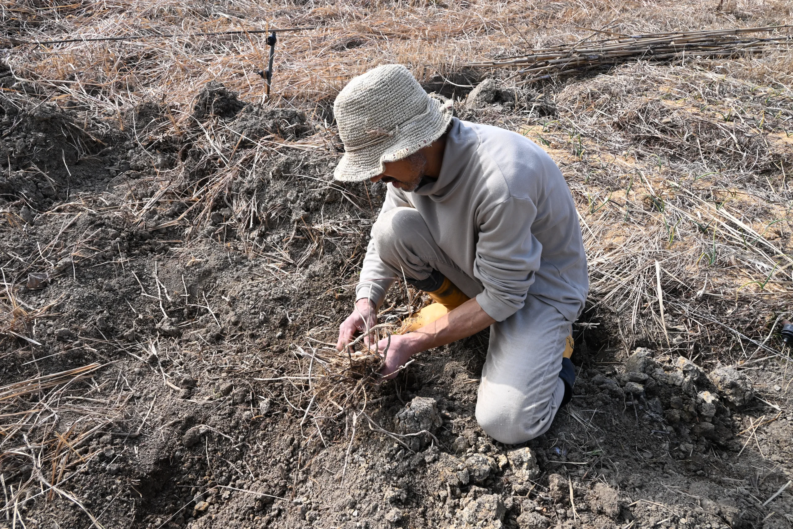チガヤや笹の根を抜いた畑では、水はけと保水のバランスを見ながら、表面の土と下の土を混ぜるようにして畝を作ることもあります。
