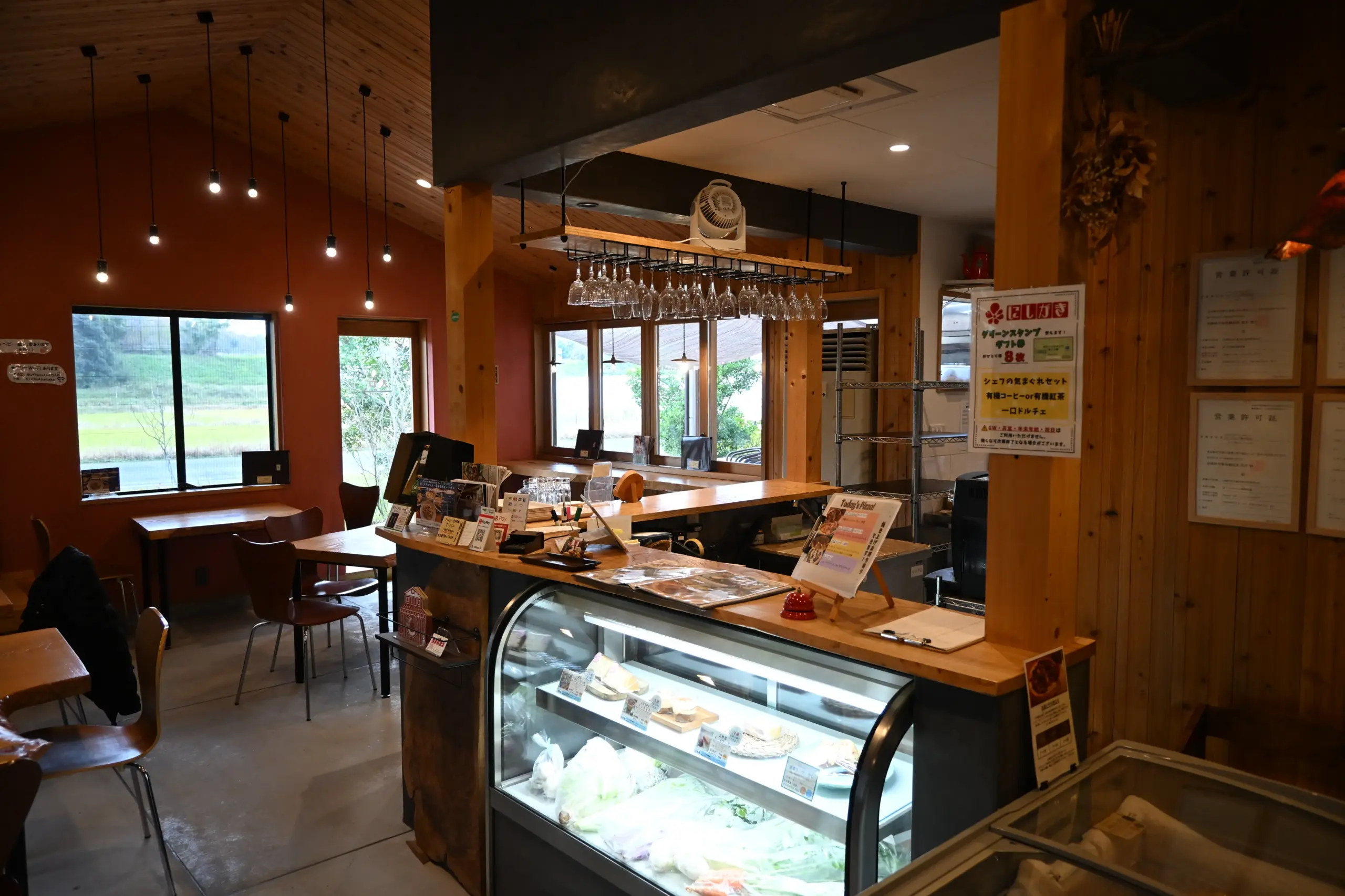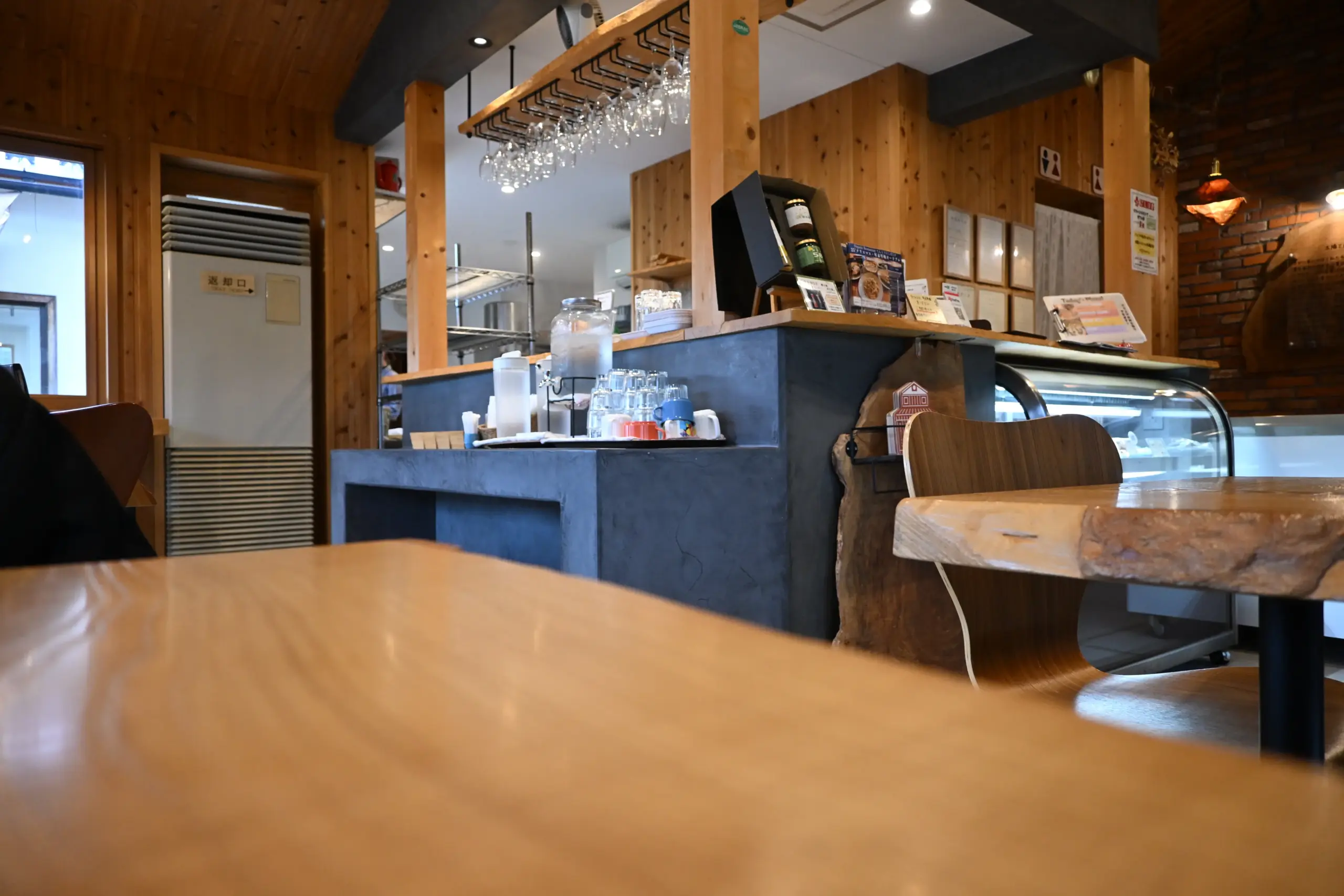 無垢材のカウンターやテーブル、丹後の和紙職人によるあたたかな照明、スタッフが手作りした看板など、店内には手仕事の温もりがあふれています。